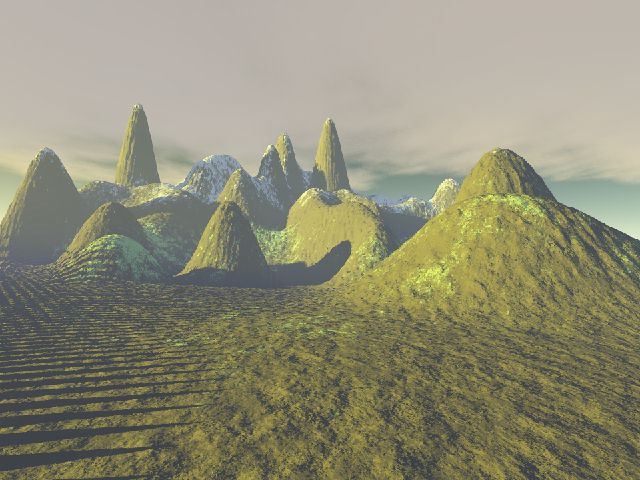 Ein Beispiel, wie man mit einigen Einstellungen dieses Programmes spielen kann: die Landschft hier besteht aus glatten Kuppen, wie sie so in der wirklichen Natur wohl kaum vorkommen. Die schlanken "Spitzen" lassen sich durch beharrliches Kreisen mit dem Mauszeiger über dem Gipfel (linke Maus gedrückt: Landschaft aufhöhen) bzw. um den Fuß des Berges (rechte Maus gedrückt: Landschaft absenken) herauskitzeln. Der zackige Schatten links resultiert wohl aus einer steil ansteigenden Wand außerhalb des sichtbar gerenderten Bildes, die nicht korrekt gerechnet wurde.