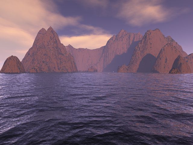 Die hier sehr viel feinere Rendering- Einstellung bewirkte eine um ein vielfaches längere Rechenzeit für dieses Bild. Dafür ist es kaum mehr von einem echten Foto zu unterscheiden. Nur die absolute Kahlheit der Felsen Läßt das Panorama etwas unnatürlich erscheinen.