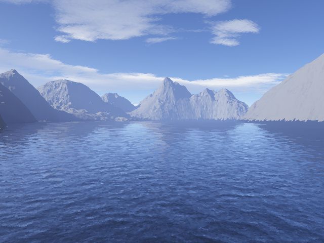 Immer noch eine graue Landschaft. Aber schon mal ein feineres Rendering und dazu etwas Wasser: ein Bergsee. Feineres Rendering bedeutet mehr Rechenzeit, aber es lohnt sich!